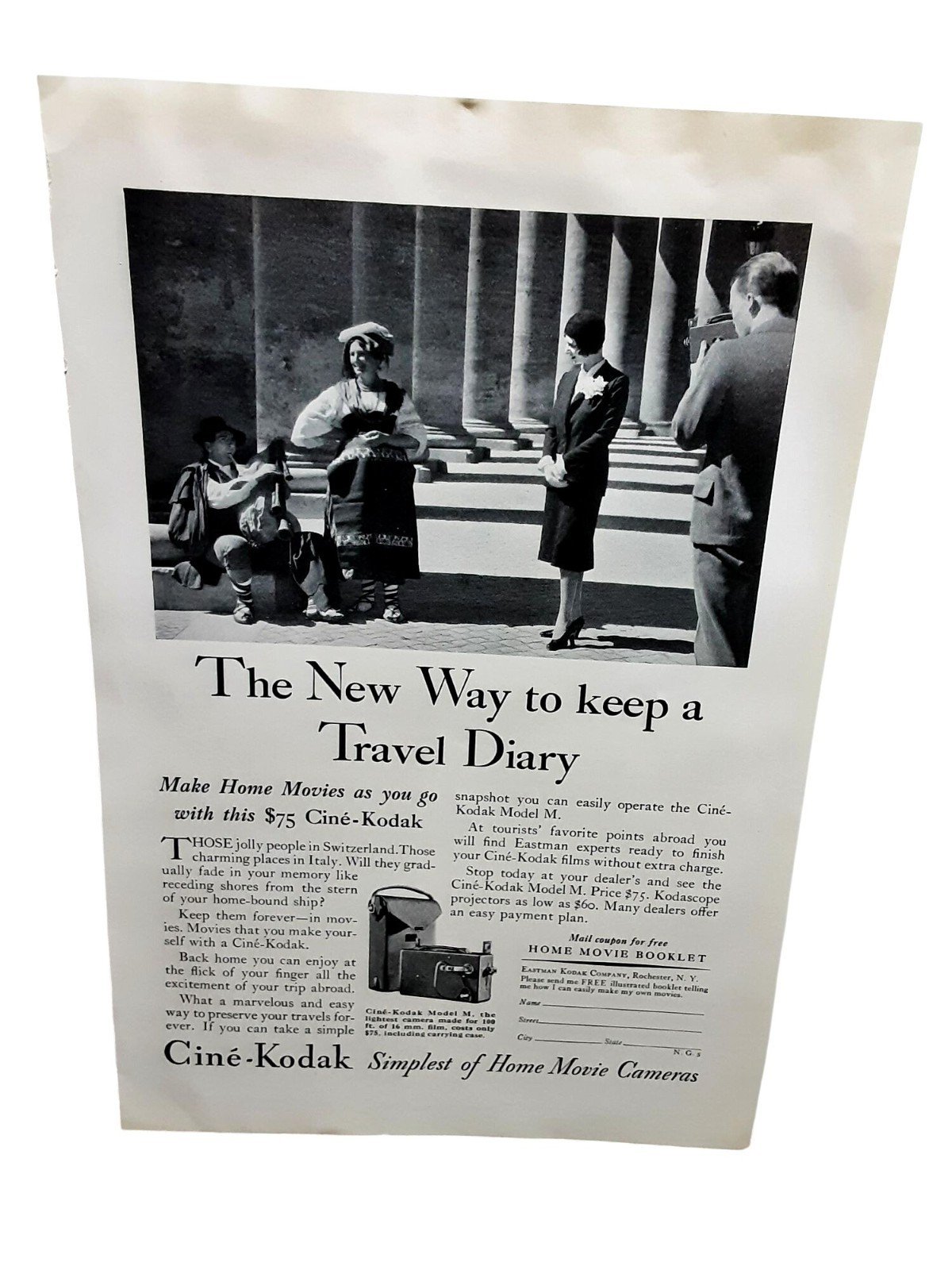 1931 Cine Eastman Kodak Model M Camera Print Ad Travel Diary 7×10