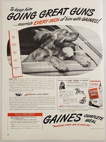 1947 Print Ad Gaines Meal Dog Food Dog Out Car Window Sherburne,New York