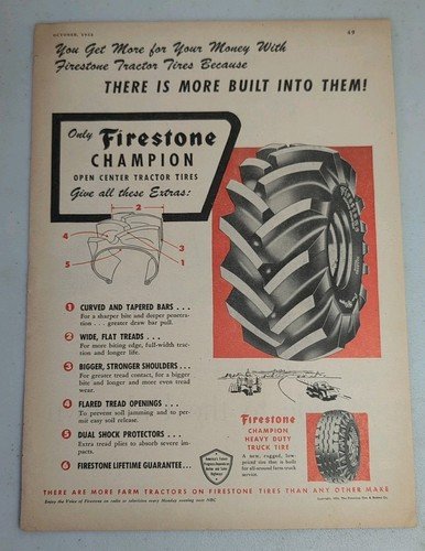 1952 Firestone Vintage Print Ad Tires Tractor Truck Champion Farm Heavy Duty