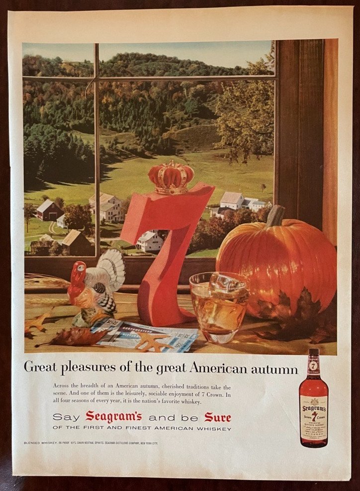 1958 SEAGRAM’S 7 Whiskey Vintage Print Ad Autumn Pumpkin Turkey