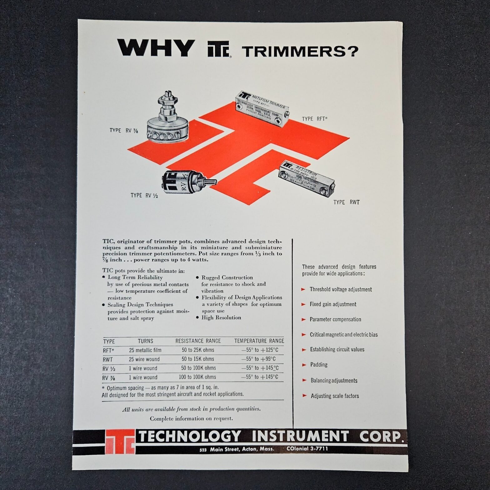 1958 TIC Technology Instrument Co Trimmer Pots Vintage Print Ad Acton MA Shop