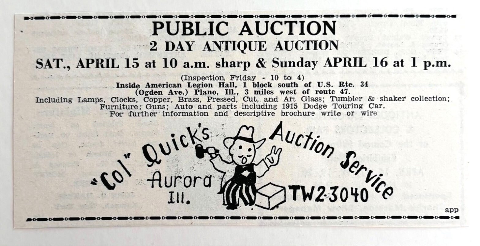 1961 Colonel Quick’s Antique Public Auction Advertisement Aurora Illinois F14D