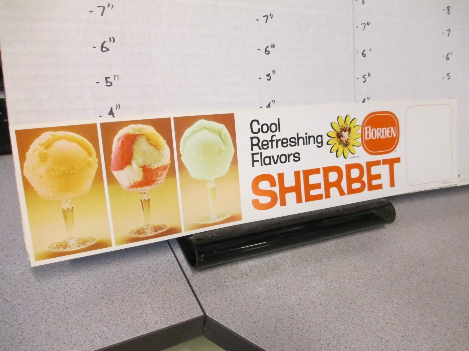 BORDEN 1970s ice cream grocery store display sign SHERBET glass bowl 4X18″