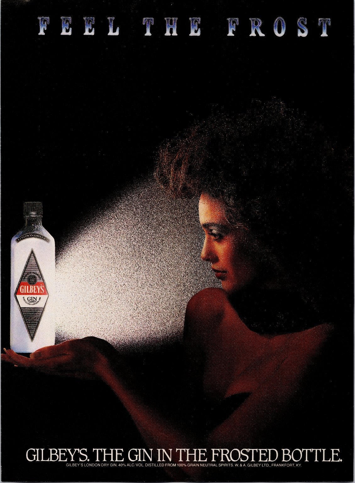 Gilbey’s Gin Feel The Frost 1980s Vintage Print Ad Pretty Woman Frosted Bottle