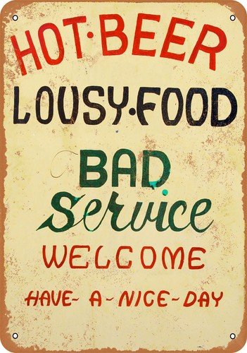 METAL SIGN – Hot Beer, Lousy Food, Bad Service – Vintage Look Reproduction