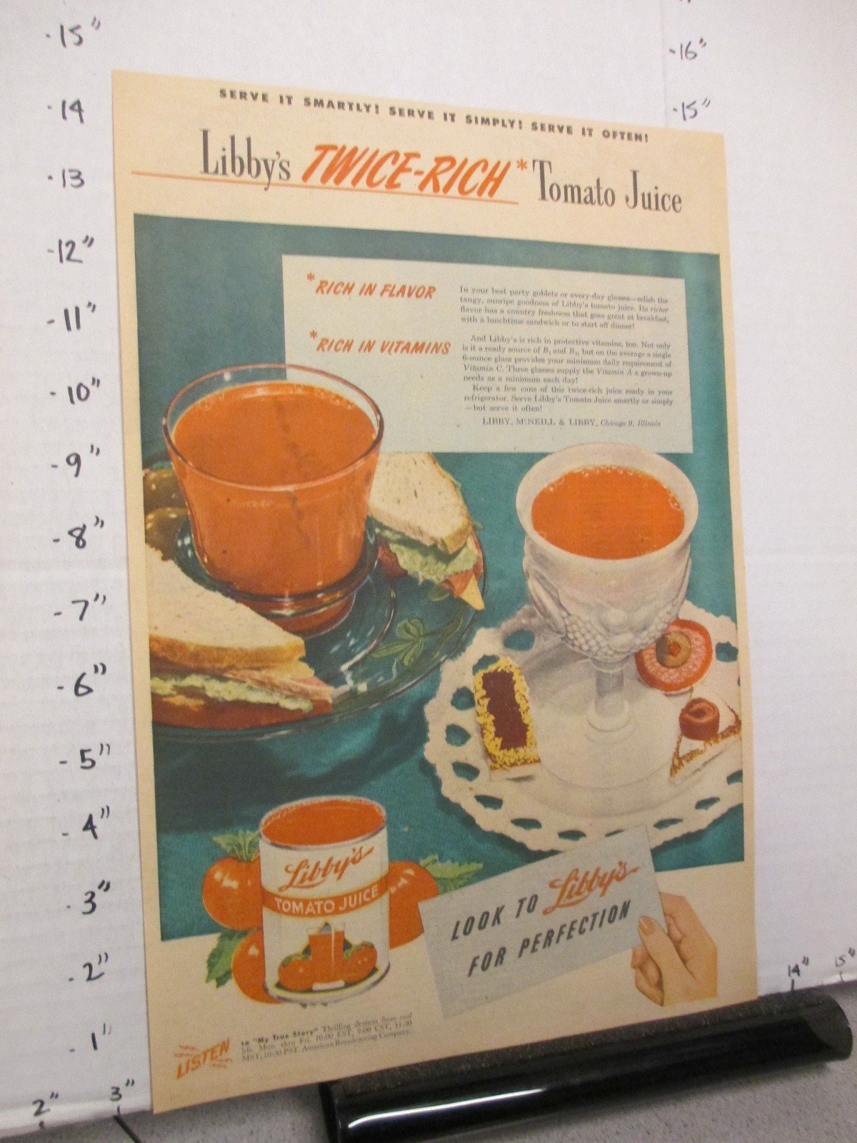 newspaper ad 1946 LIBBY’S tomato juice can drinking glass American Weekly
