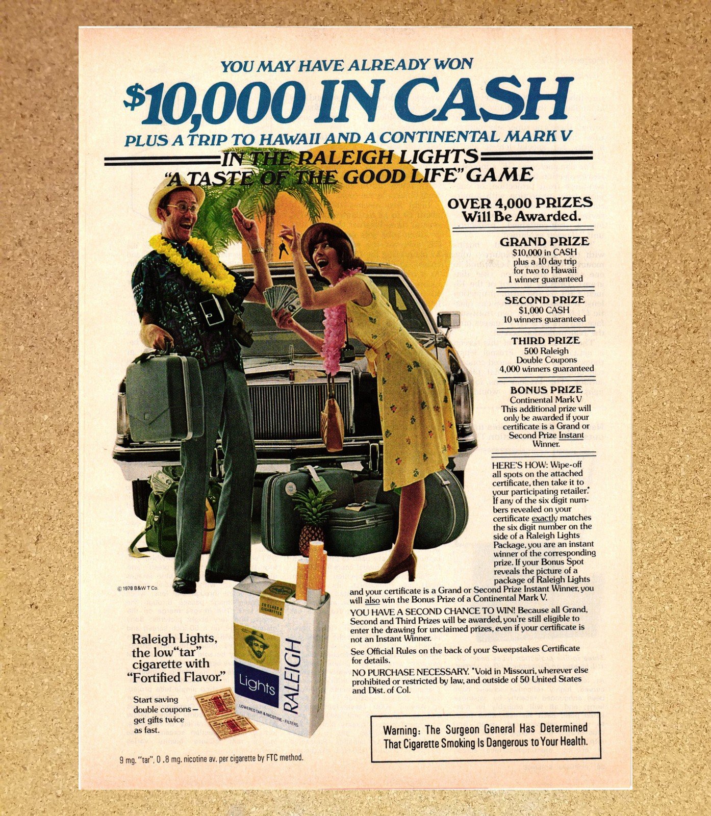 Raleigh Cigarette Hawaii Continental Mark V – Magazine Print Ads Poster 1978