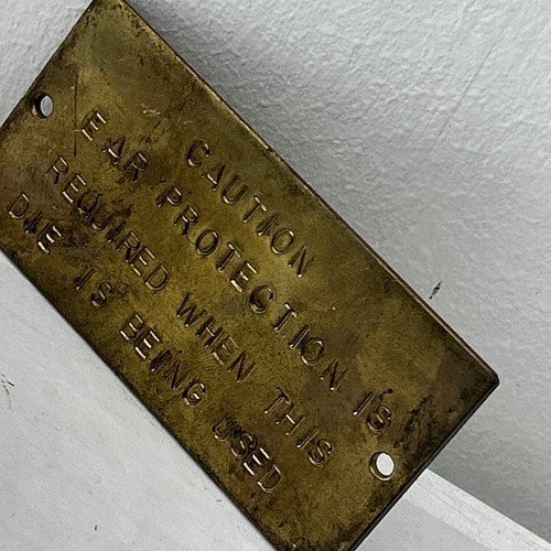 Vintage Factory Bronze Safety Plate. Caution Ear Protection Required Industrial