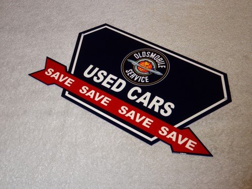 VINTAGE OLDSMOBILE USED CARS ARROW 12″ METAL EARTH RINGS TRUCK GASOLINE OIL SIGN